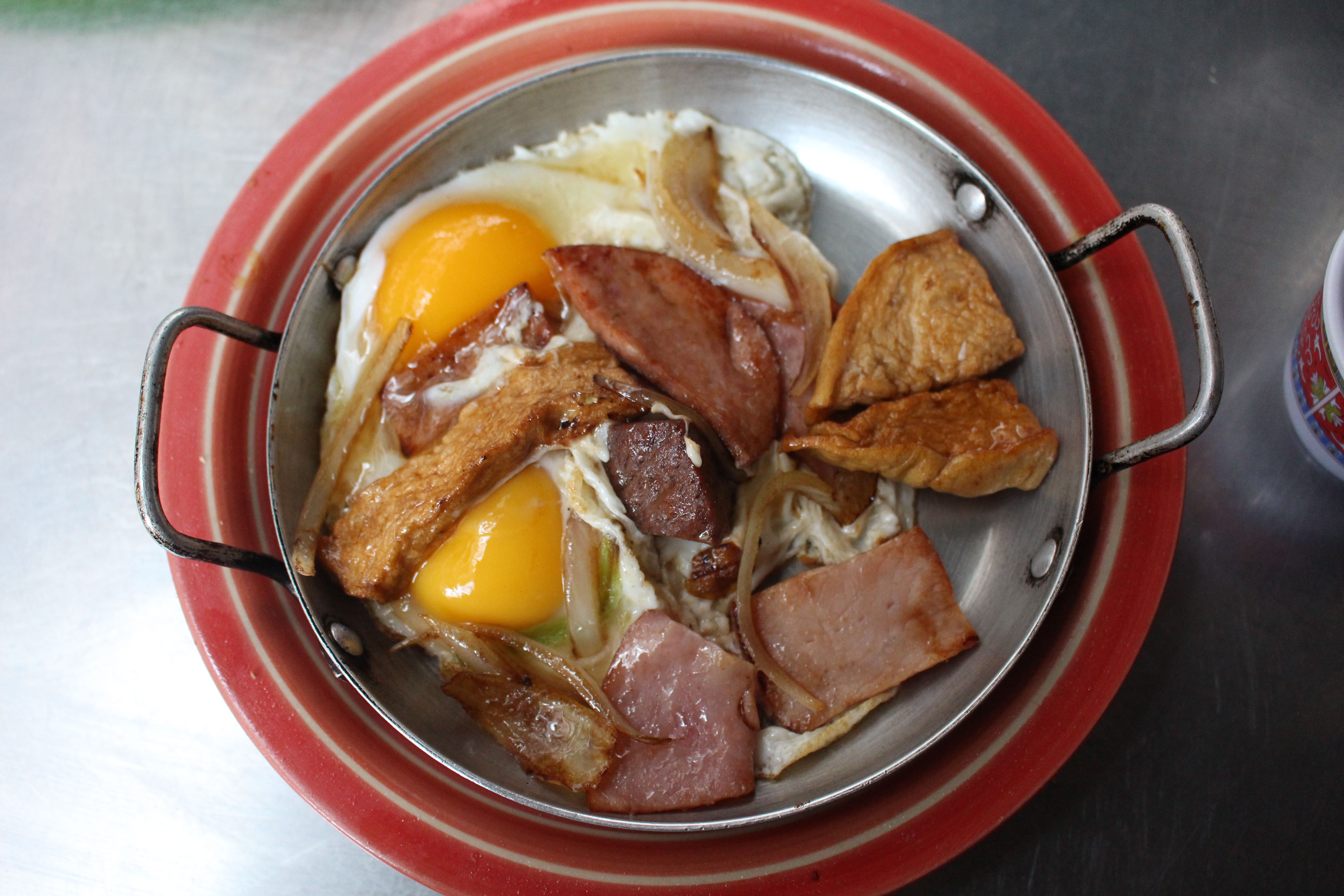 Khi hành tây chín, đập trứng gà vào chảo. Tiếp đó lần lượt cho pate, thịt nguội, xúc xích, thịt xông khói, chả cá lên trên. Cuối cùng rắc ít tiêu, bột ngọt
