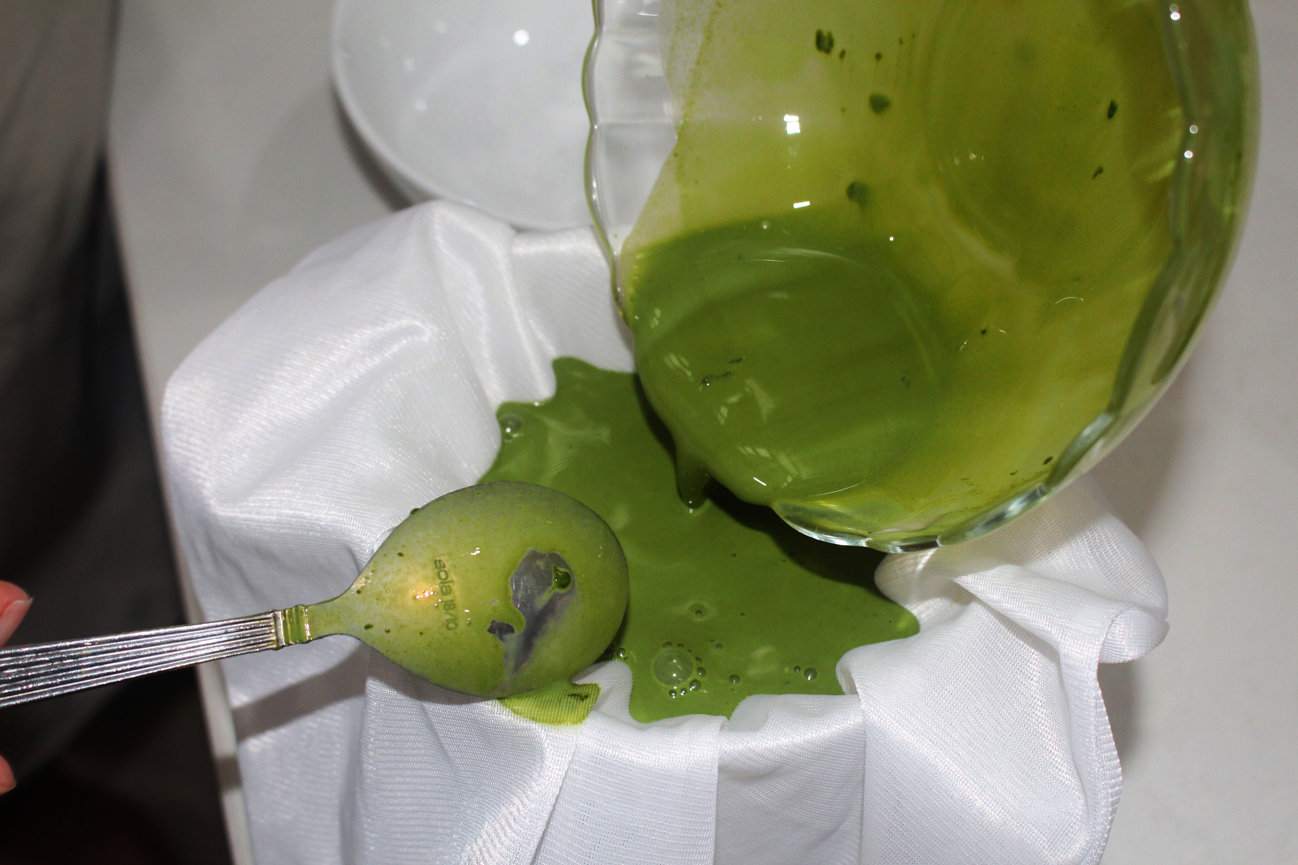 Lọc hỗn hợp matcha và sữa tươi qua vải mỏng để loại bỏ phần matcha vón cục. Ảnh: Huỳnh Hằng. |