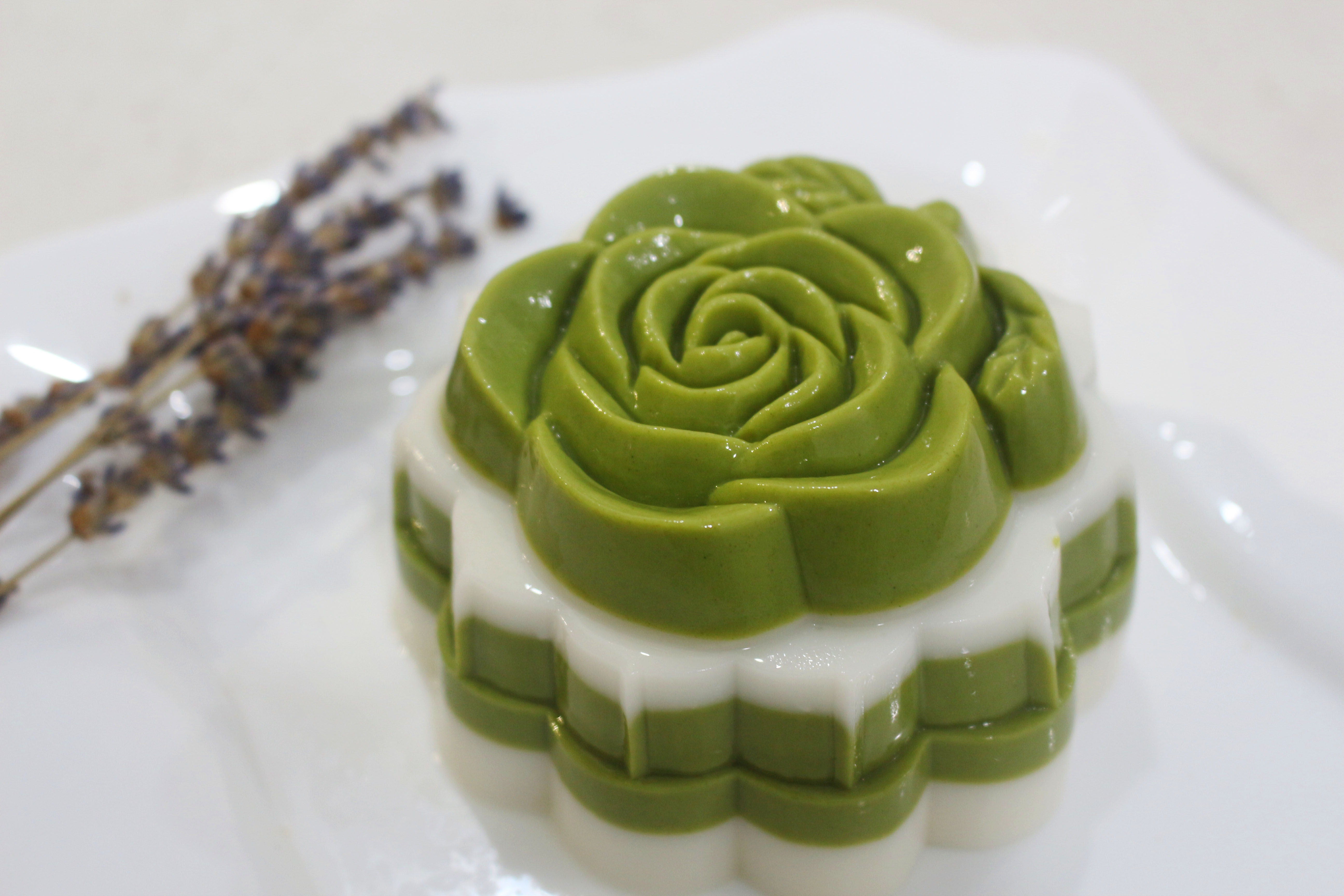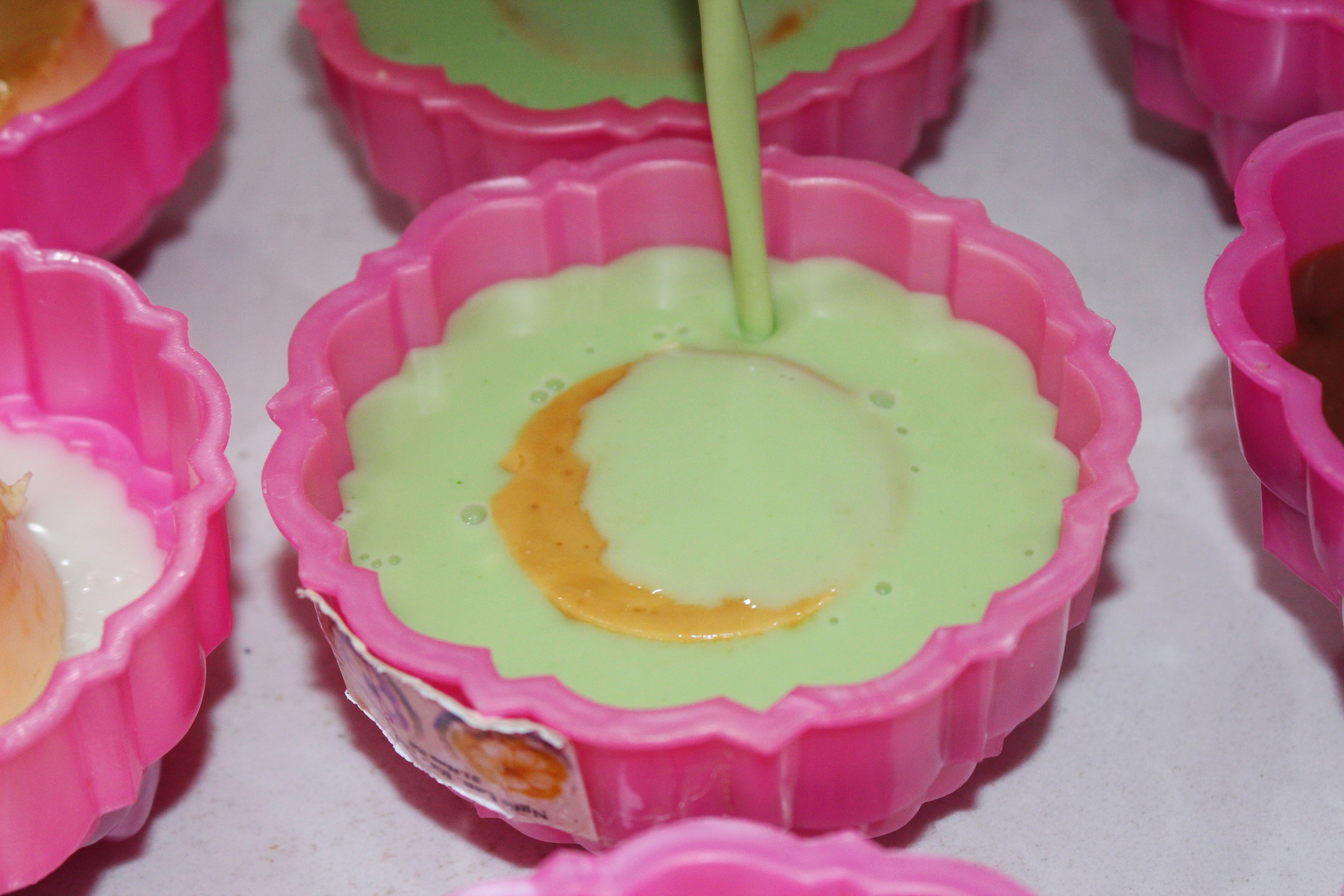 Khi hỗn hợp rau câu sôi, dùng vá múc khoảng 500 ml cho vào phần bột matcha, quậy đều. Đổ một lớp rau câu matcha mỏng vào đáy khuôn. Đổ lần lượt đến hết khuôn.