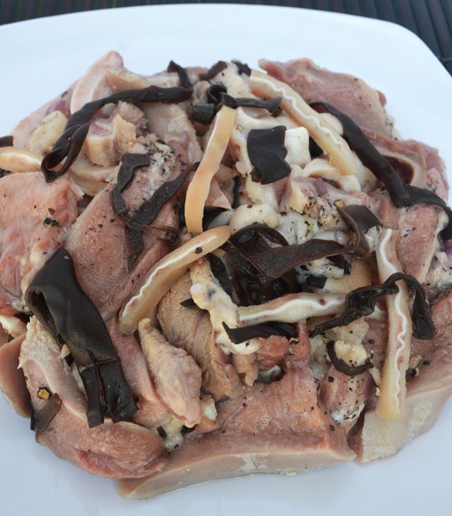 Tai, mũi, lưỡi heo rửa sạch, đun nước sôi, trụng lại rồi cạo sạch lông, đặc biệt vệ sinh sạch vành và nhĩ tai.