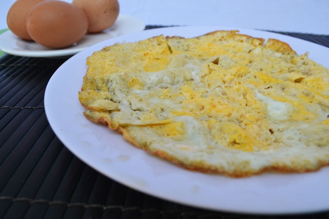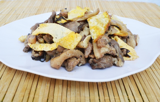 Trứng gà đập ra tô, đánh đều, sau đó cho vào chảo tráng mỏng, xúc ra đĩa, xắt thành miếng mỏng.
