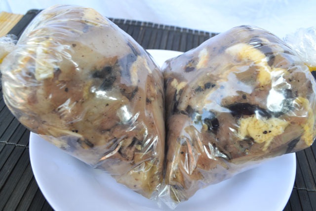 Lồng 2 túi nilon lại với nhau, lấy muỗng múc thịt cho vào. Dùng tăm châm một vài lỗ nhỏ để nước mỡ và hơi thoát ra. Cho đến đâu, nhấn thật chặt đến đó. Sau đó dùng dây thun cột lại cho thật chặt.