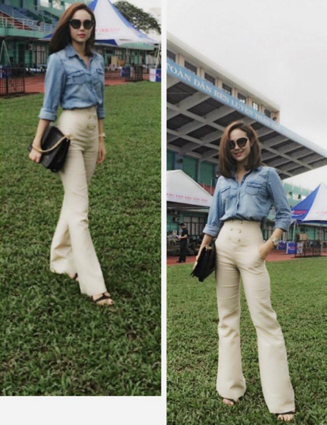 Jeans trắng dáng loe cổ điển giúp cô tôn thêm cặp chân dài.