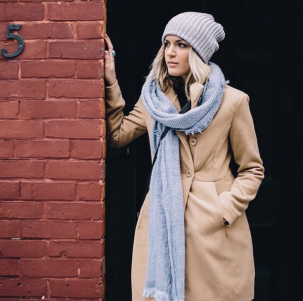 | Chiếc khăn màu xanh nhẹ nhàng là nhân tố hoàn hảo để khiến cho áo khoác nâu camel bừng sáng. |