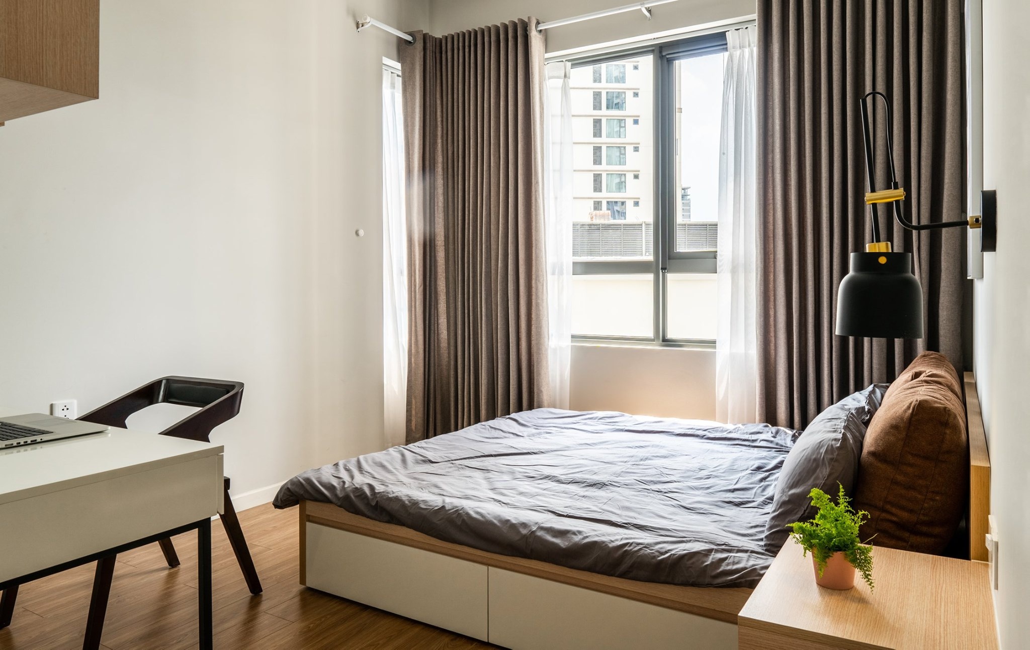 Thông thường, không gian nhỏ phù hợp với phong cách Minimalism hoặc Scandinavian. Những màu trung tính mang lại cảm giác rộng, thoáng nhưng nhàm chán và thiếu chiều sâu. Đây là lúc bạn có thể dùng một vài phụ kiện có màu sắc mạnh nhấn nhá, như gối trang trí hoặc tranh ảnh.