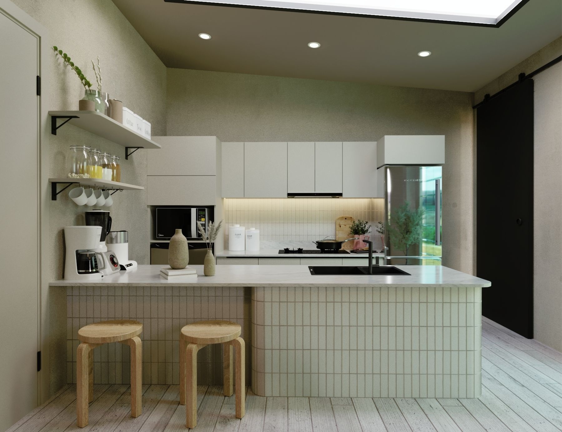 Kết hợp tủ kín bên dưới, kệ hở bên trên là cách sắp xếp gọn gàng và hiện đại hơn. Bên cạnh đó, người sử dụng bếp còn có thể dễ dàng lấy gia vị, nguyên liệu cần thiết mà không mất thời gian tìm.