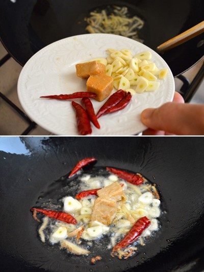 - Sau đó, bạn cho ớt khô, tỏi, chao, đường, muối và ít tiêu vào.