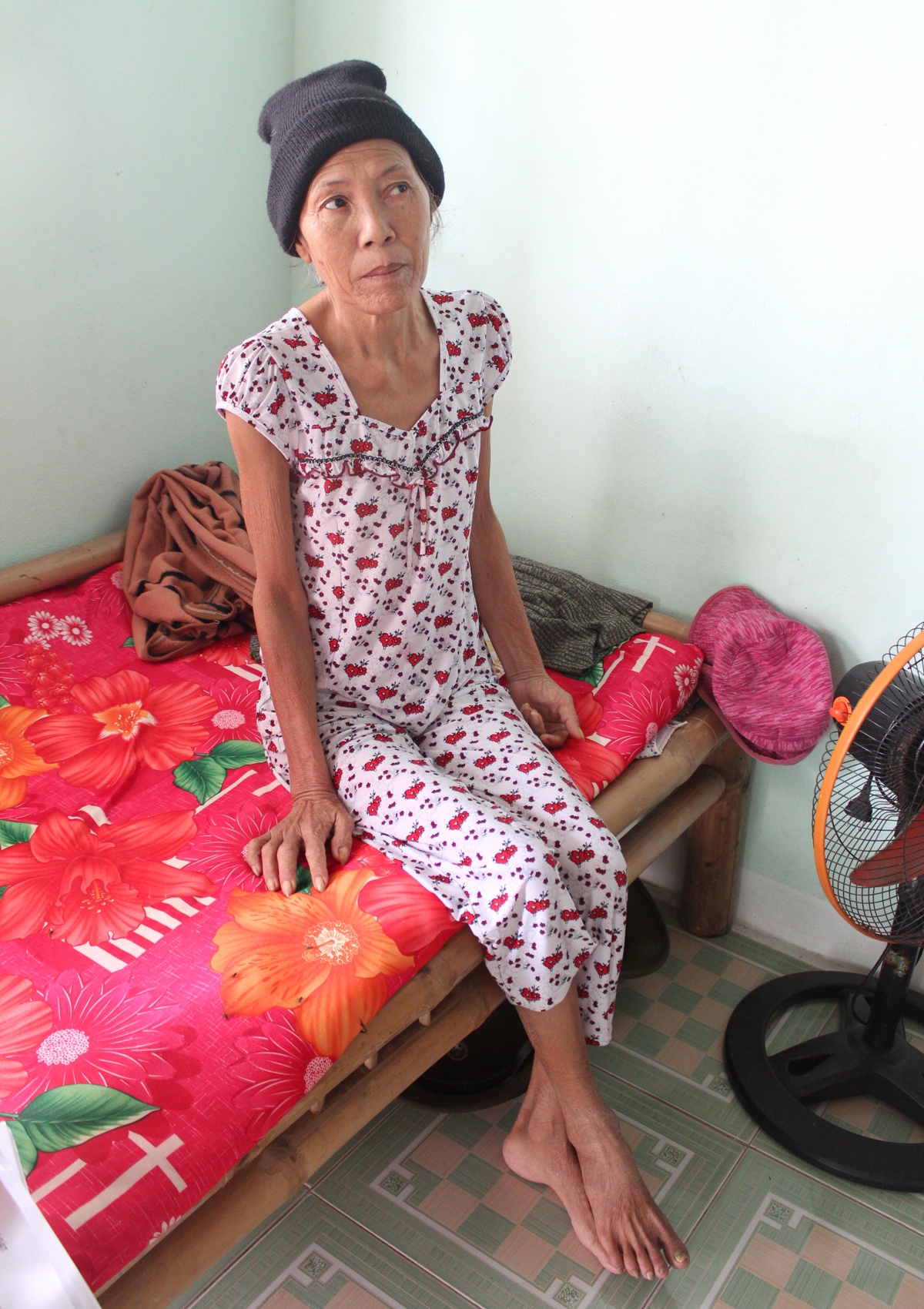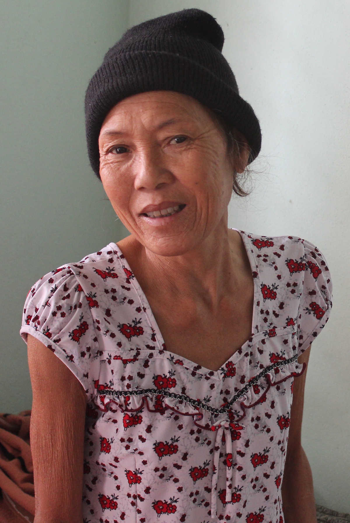 Khi anh Võ Như Sơn đưa chúng tôi đến gặp cô Mười, dù bệnh đang nằm nghỉ trên giường cô vẫn trông khá sạch sẽ. Đội chiếc nón len để che cái đầu không còn bao nhiêu tóc vì xạ trị, cô Mười ngồi dậy, cười đón khách.