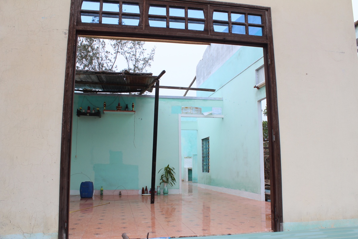 | Căn nhà trống trơn, chỉ còn lại chiếc bàn thờ được che tạm bằng mái tôn sau bão. |