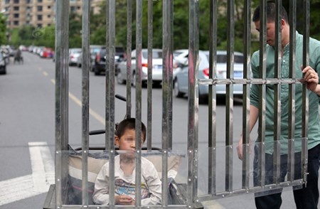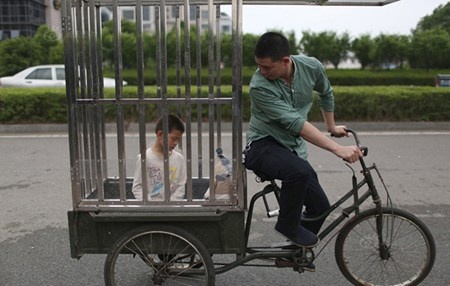 Cách đây ít ngày, nhiều người ở thành phố Đài Châu (tỉnh chiết Giang, Trung Quốc) chứng kiến cảnh tượng một người đàn ông đạp xe ba bánh, phía sau chở cậu bé khoảng 9-10 tuổi bị nhốt trong lồng.