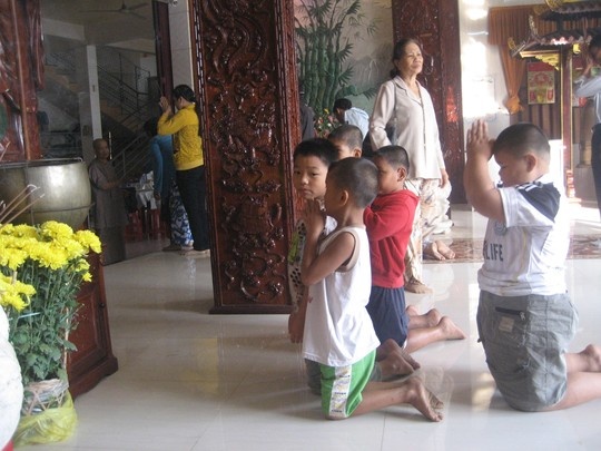 | Các cháu nhỏ chùa Bửu Trì khấn vái nơi thờ Phật. |