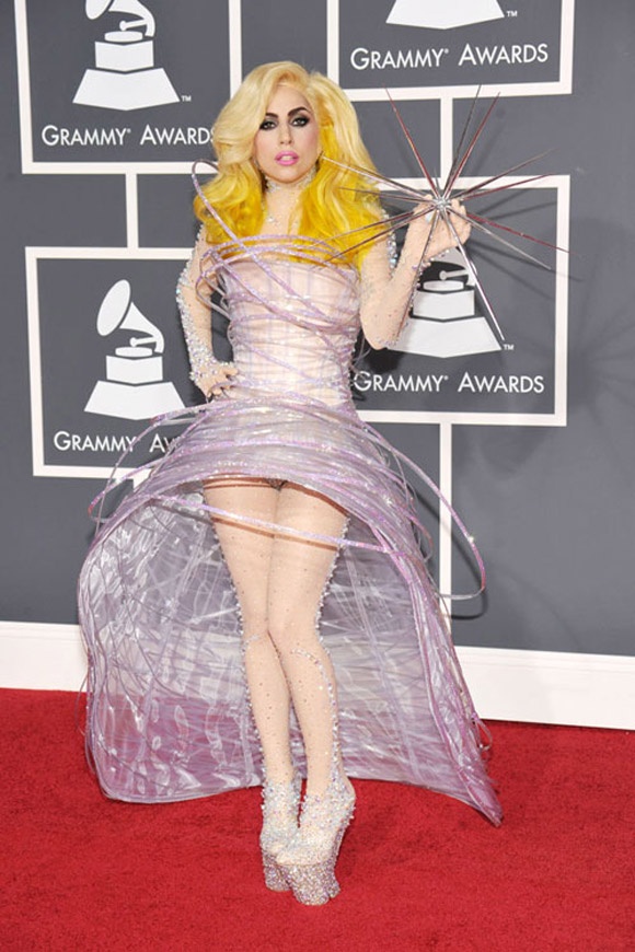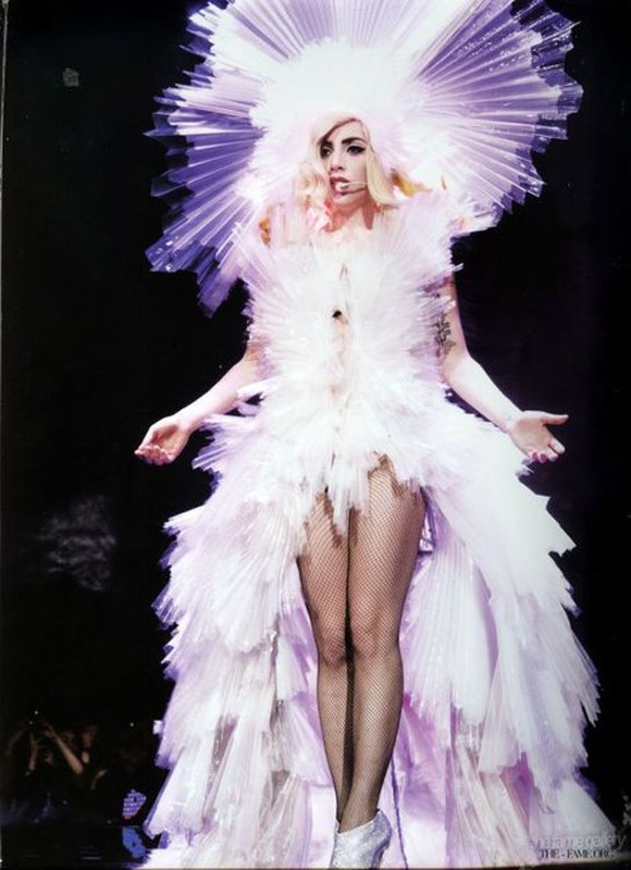 | Lady Gaga trông giống như nữ hoàng băng giá trong bộ váy với những đường cắt tua tủa. |