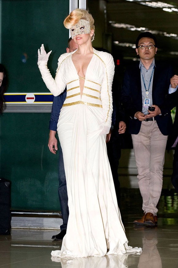 | Bộ váy trông sẽ vô cùng bình thường nếu như Lady Gaga không kết hợp cùng chiếc mặt nạ ngọc trai. |