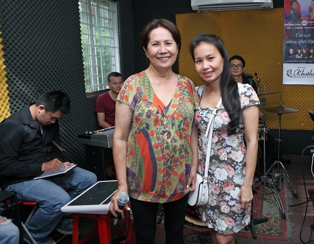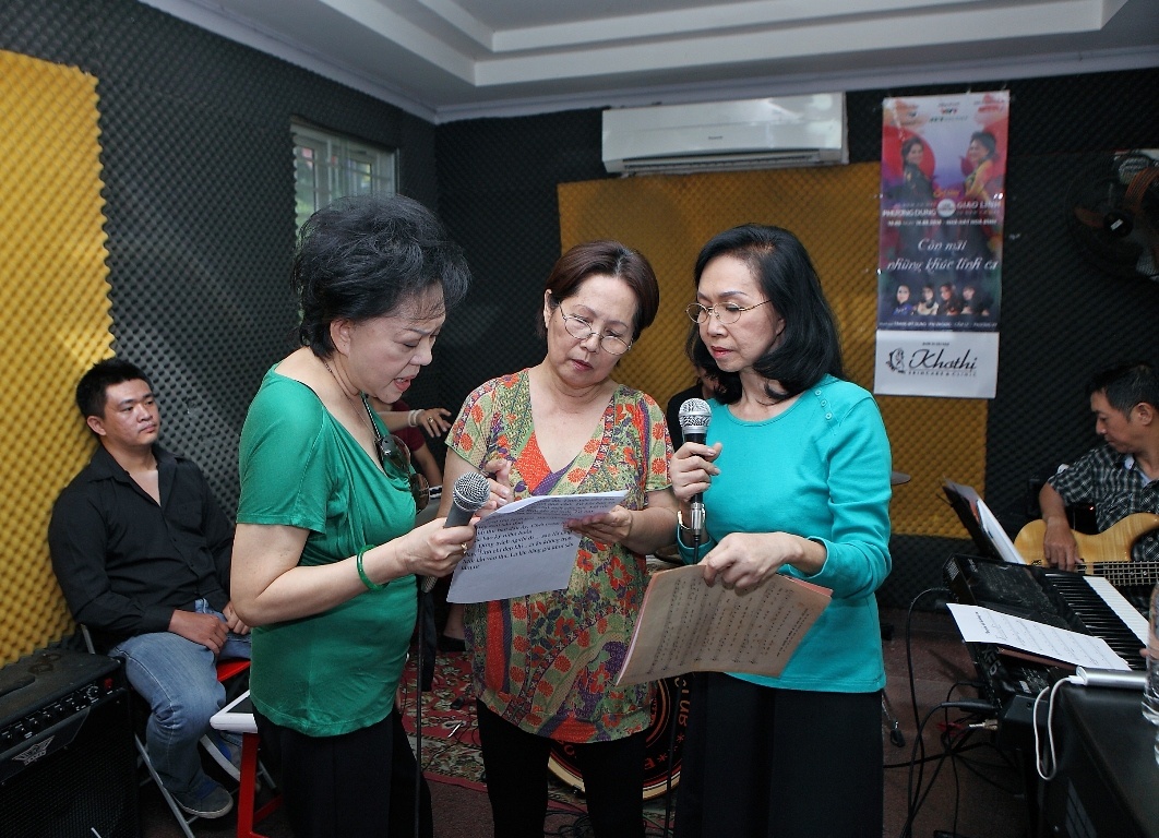 | Nữ ca sĩ Cẩm Ly sẽ có màn kết hợp cùng "nhạn trắng Gò Công" Phương Dung trong ca khúc Về đâu mái tóc người thương của nhạc sĩ Hoài Linh. Hai giọng ca của hai thế hệ đã có sự phối hợp rất ăn ý trong lúc luyện tập. |