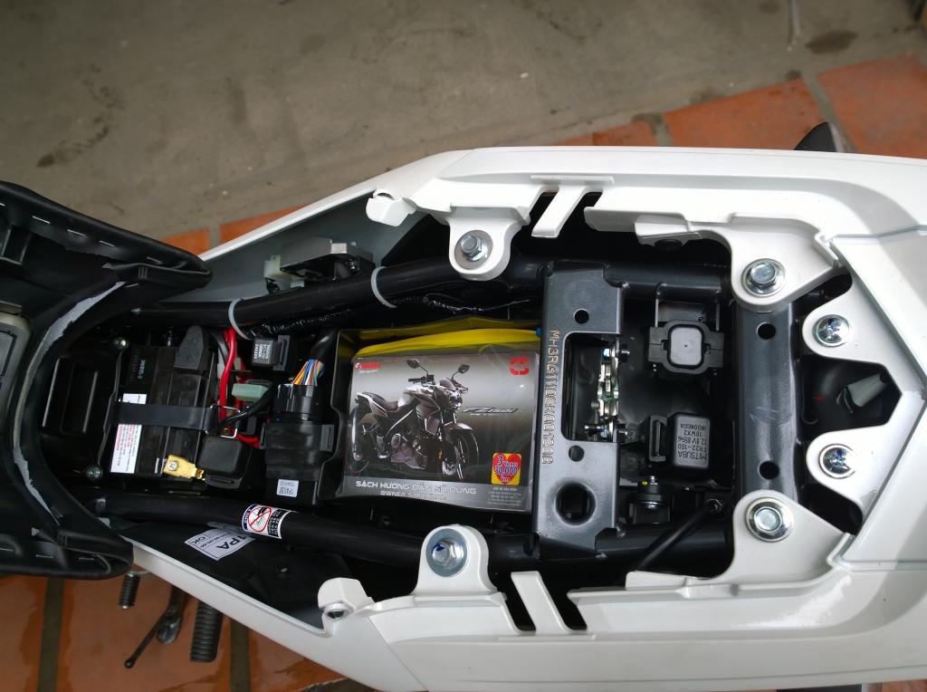 Vị trí đặt ắc quy và hộc đồ sát gần nhau, dây điện, IC, cầu chì... loằng ngoằng nhìn thấy hết. Đại khái là về không gian cũng rộng rãi không kém mấy khi so với cốp đựng đồ của Exciter và ăn đứt cái hốc nông choẹt của Raider R150. Cái chỗ để quyển sách dướng dẫn sử dụng chính là phần vuông vắn để chứa đồ lớn nhất dưới yên FZ150i. Tuy cũng hơi nông nhưng phần khoang phình ra phía hai bên thừa đủ chỗ nhồi nhét 2 cái áo mưa mỏng cùng vài thứ lặt vặt và túi đồ nghề sửa chữa khẩn cấp.
