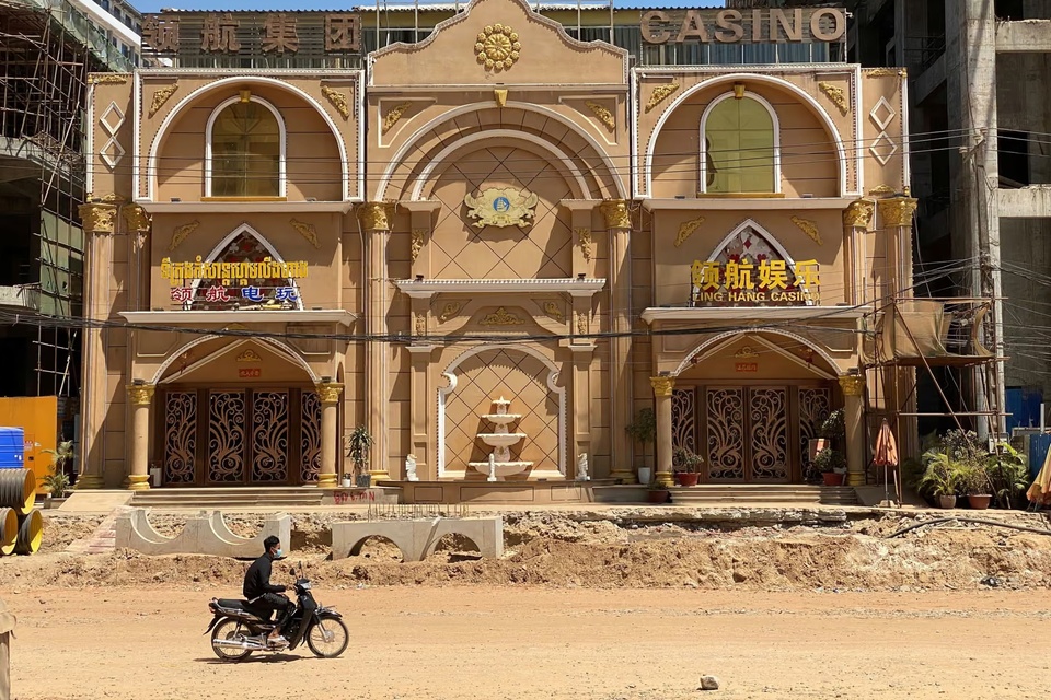 Một người đi xe máy chạy ngang một sòng bạc đã đóng cửa ở Sihanoukville, Campuchia. Ảnh: Matthew Tostevin/Reuters. |