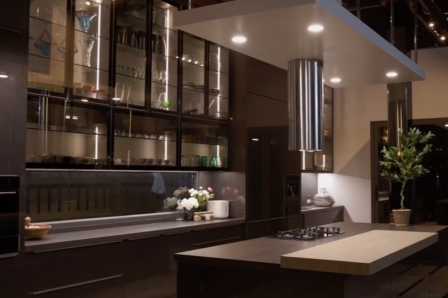 Việc sử dụng thiết bị nhà bếp thông minh và lưu trữ đồ dùng trong tủ, hộc tạo cảm giác tối giản và sang trọng.