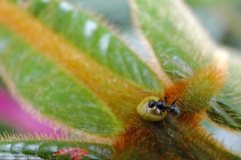 | Kiến hút chất dịch ngọt trên một thứ giống như đĩa của cây Vì dịch ngọt, kiến sẵn sàng tấn công những côn trùng gây hại để bảo vệ cây. Đây là một kiểu cộng sinh kỳ thú giữa động vật và thực vật. Ảnh: Kristhian Castro Valencia. |