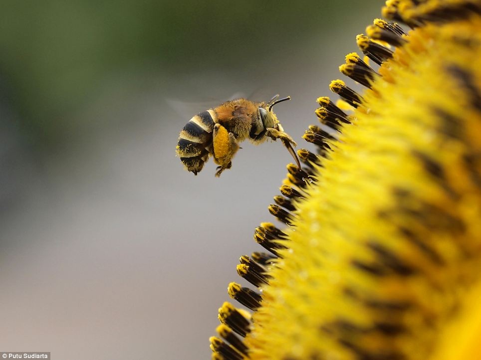 | Ong hút mật từ bông hoa hướng dương. Phấn của hoa bám vào thân của ong. Ảnh: Putu Sudiarta. |