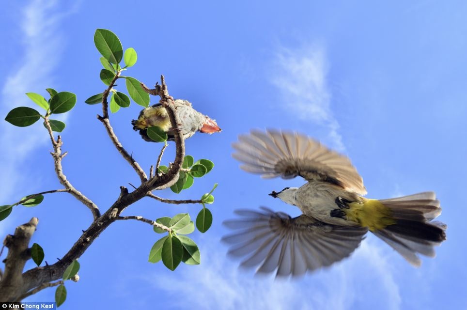 | Chim mẹ mớm mồi cho đứa con trên cành cây sau một chuyến săn mồi. Ảnh: Kim Chong Keat. |