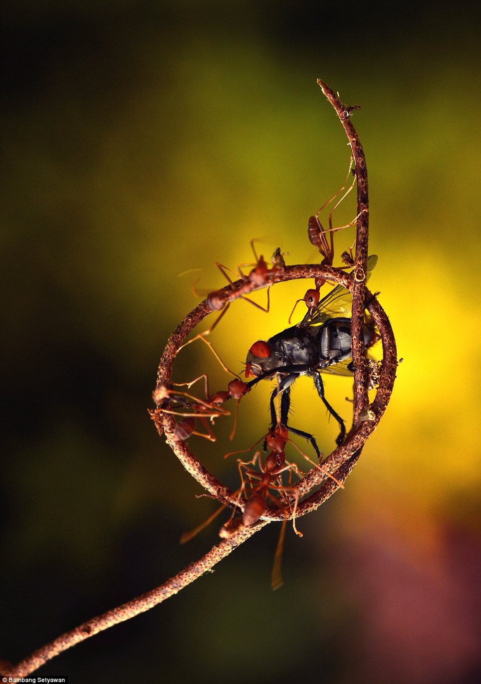 | Những con kiến bao vây và giết một con ruồi để làm thức ăn tại Indonesia. Ảnh: Bambang Setyawan. |