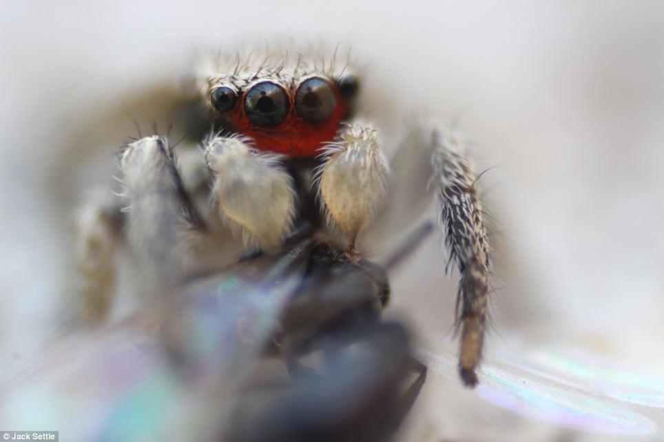 | Nhện nhảy ước lượng chính xác khoảng cách giữa nó và con mồi rồi chọn thời điểm thích hợp để tấn công và tiêm nọc độc vào cơ thể con mồi. Ảnh: Jack Settle. |