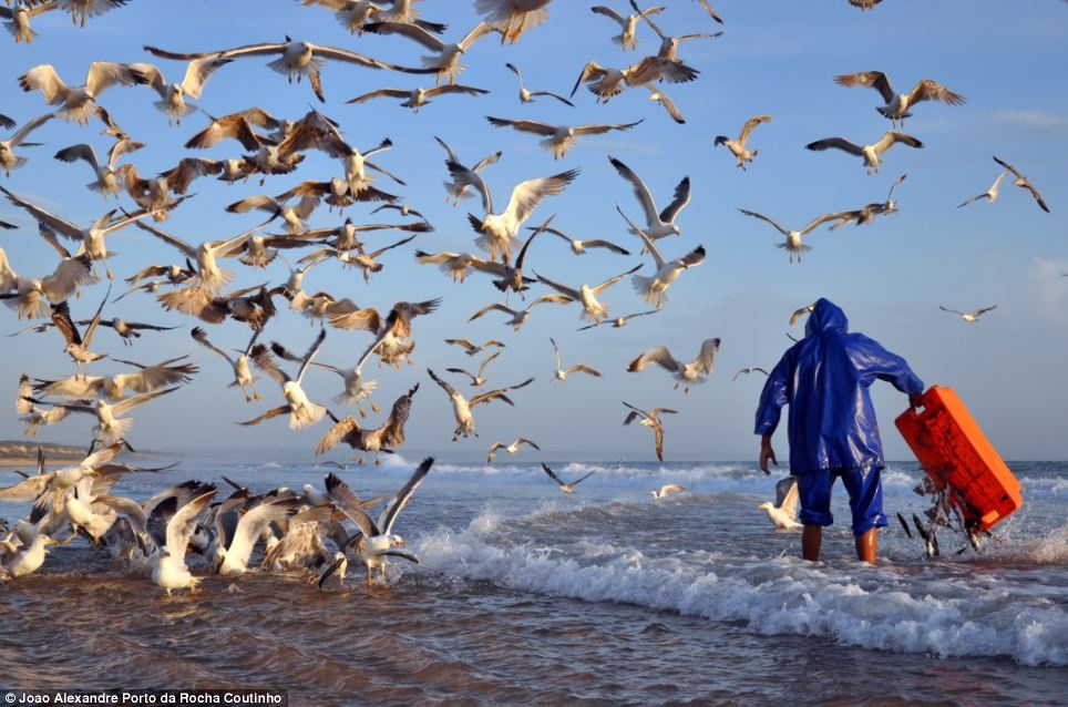 | Một ngư dân đổ cá chết trên bờ biển vào cuối chiều. Như thường lệ, lũ mòng biển chờ sẵn để đón bữa ăn thịnh soạn và dễ dàng. Ảnh: Joao Alexandre Porto da Rocha Coutinho. |