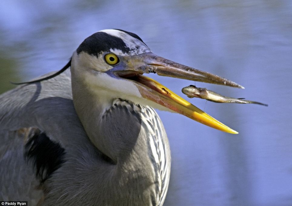 | Một con cá bật lên không trung như mọi khi, song vào ngày định mệnh nó đã nhảy đúng mồm của con diệc xanh. Ảnh: Paddy Ryan. |