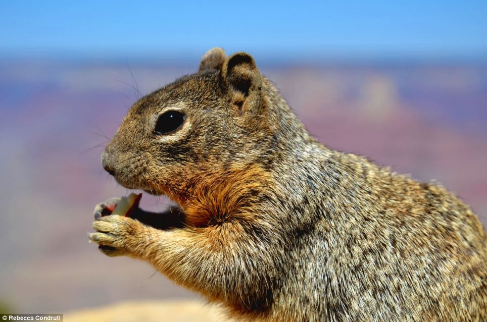 | Con sóc ăn mẩu táo mà du khách vứt trong hẻm núi Canyon nổi tiếng ở Mỹ. Bức ảnh cho thấy những mẩu thức ăn thừa của con người có thể trở thành nguồn thực phẩm quan trọng đối với động vật hoang dã. ẢNh: Rebecca Condruti. |