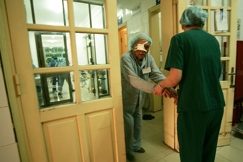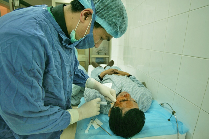 | Đây là một ca mổ mắt do tiến sĩ, bác sĩ Hoàng Thị Minh Châu tiến hành. Bệnh nhân đang nằm trên giường là một người già, ông bị mờ giác mạc đã gần 2 năm. Trước giờ tiến hành mổ, ông được tiêm gây tê. |