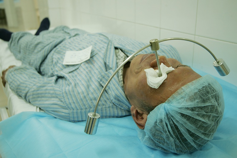 | Ông bị cả hai mắt nhưng chỉ tiến hành từng mắt một vào hai thời điểm khác nhau mà không thay liền được cùng một lúc. |