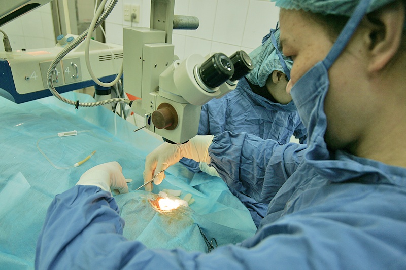 | Bác sĩ phẫu thuật chính và kíp mổ cùng kiểm tra giác mạc mới trước khi cấy ghép. |