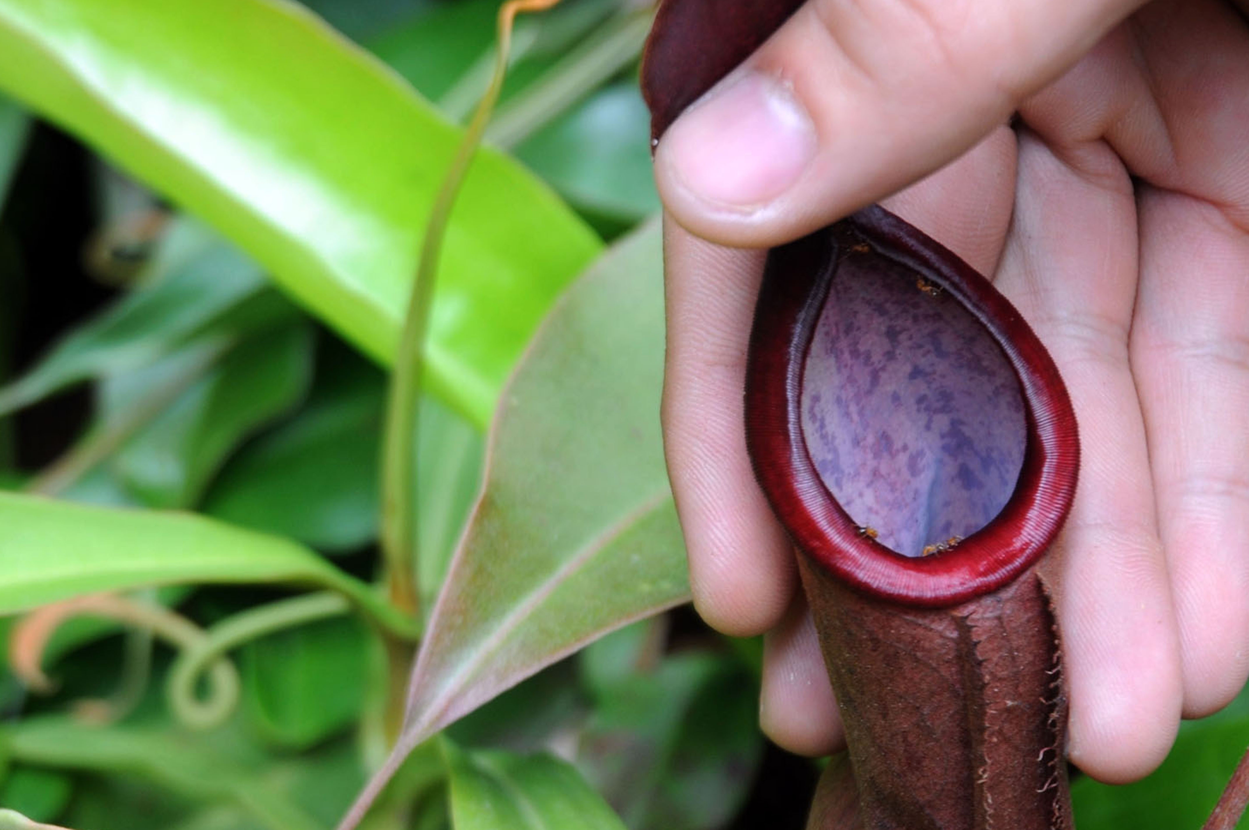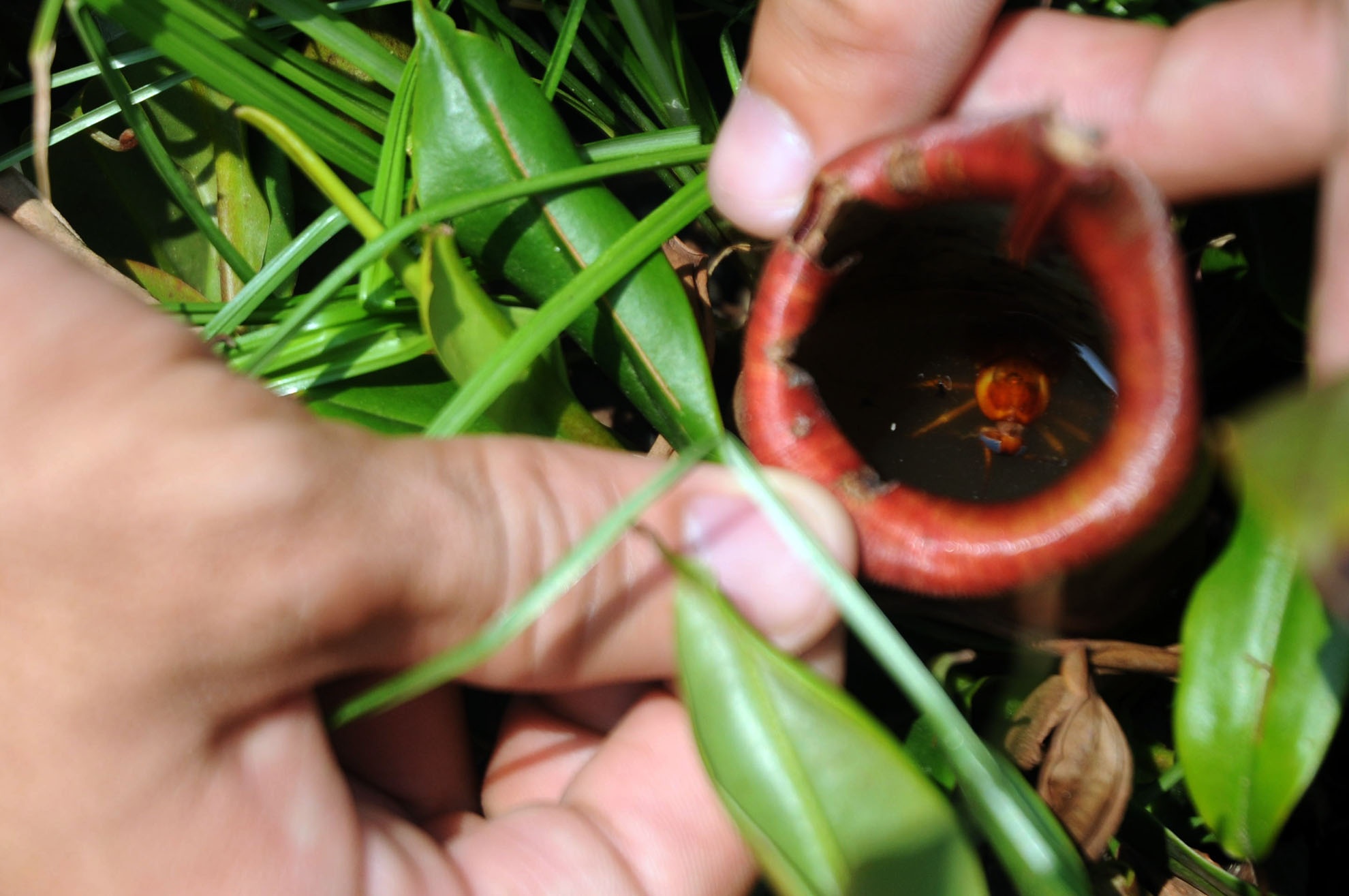 | Cấu tạo "ấm" với chất dịch ở đáy và lông măng trơn trượt ở thành khiến con mồi rơi vào bẫy không thoát ra được. Xác côn trùng sẽ phân hủy dần và trở thành thức ăn cho cây. |