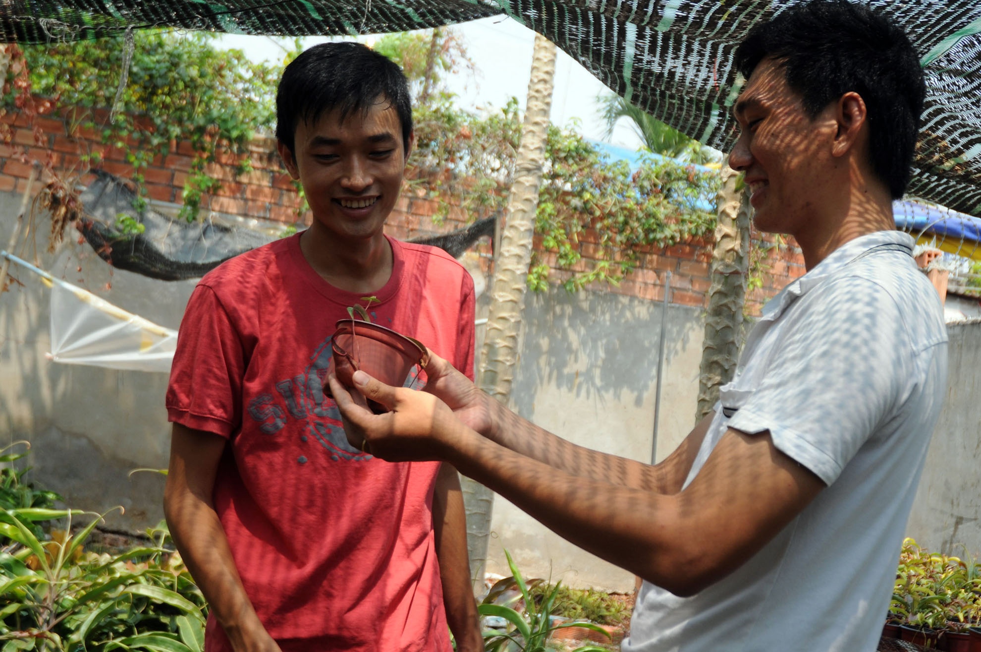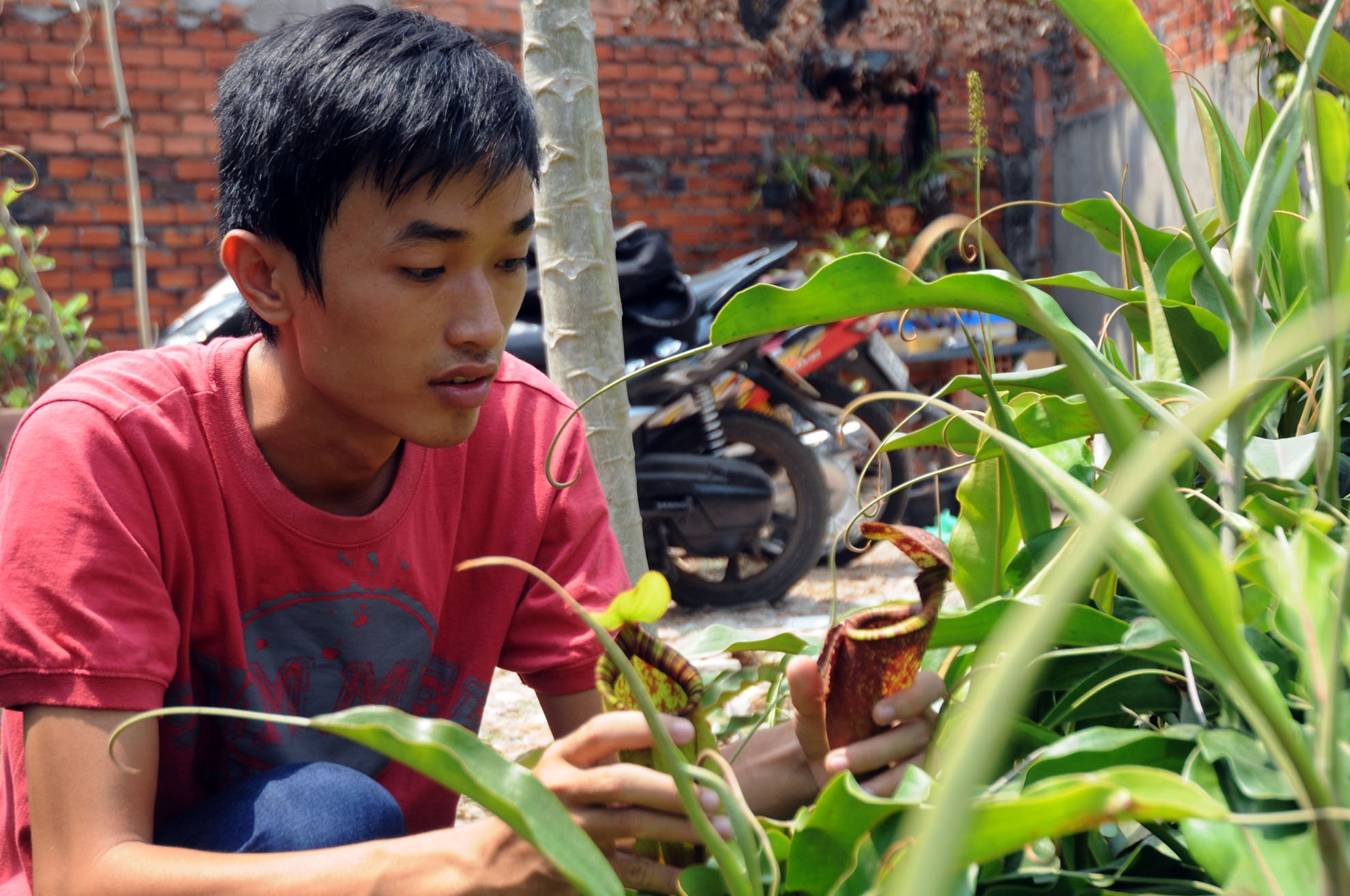 | Trong vườn ươm của anh Phương hiện có khoảng hơn 100 cây nắp ấm với nhiều màu và hình dáng khác nhau. Lúc đầu, anh Phương chỉ trồng cây bắt mồi như một thú vui, nhưng sau này nhiều người tìm mua nên anh bắt đầu tính tới chuyện kinh doanh. |