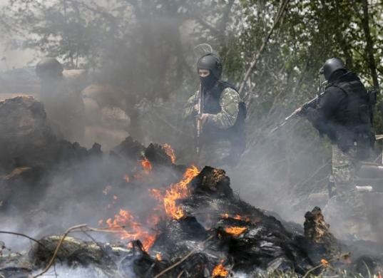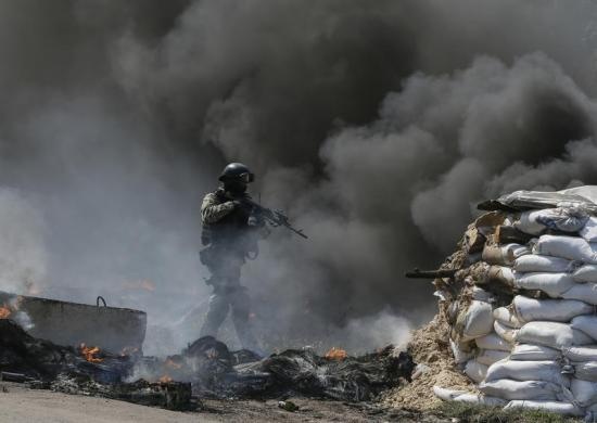 | Binh sĩ Ukraina tại chốt an ninh gần thành phố Slaviansk ngày 24/4. Chốt an ninh cháy rực sau khi quân đội Ukraina giành lại quyền kiểm soát. |
