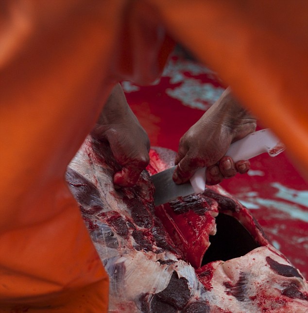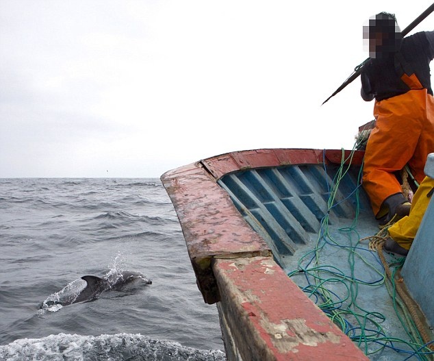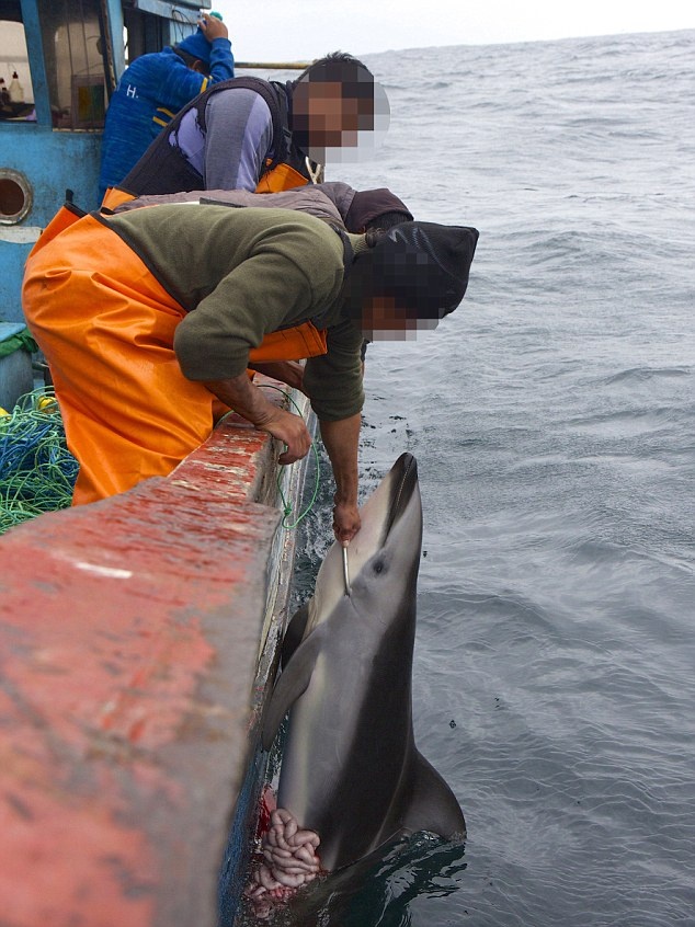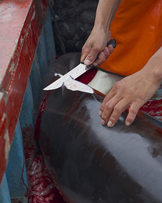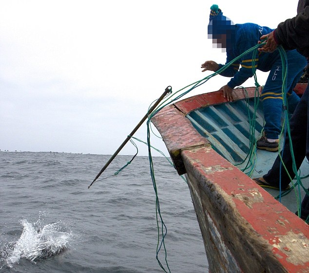 | Ngư dân mổ cá heo rất thành thạo bởi họ đã quá quen với việc này. Sau đó, họ dùng chính thịt cá heo để câu cá mập. Ảnh: Daily Mail. |
