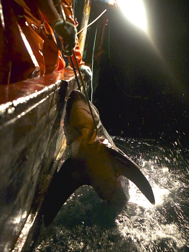 | Ngư dân trên thuyền dùng móc câu kéo con vật lên. Bụng con cá heo rách vì lao của ngư dân. Ảnh: Daily Mail. |