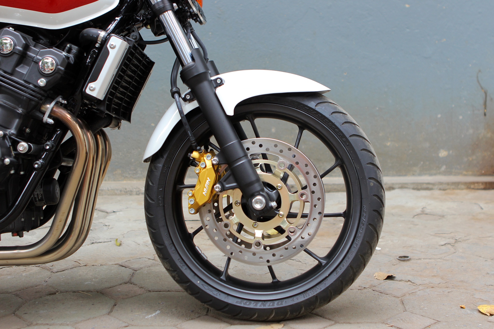 | Trang bị an toàn phía trước là hệ thống phanh đĩa đôi thủy lực, đường kính 285 mm. Đi cùng bộ vành đúc 10 chấu đơn. Kích thước lốp trước là 120/60-17. Phuộc trước của của CB400 Super Four dạng telescopic, đường kính 41 mm, với hành trình 118 mm. |