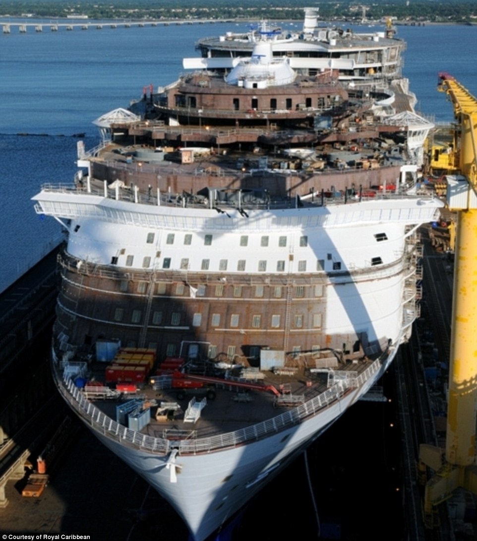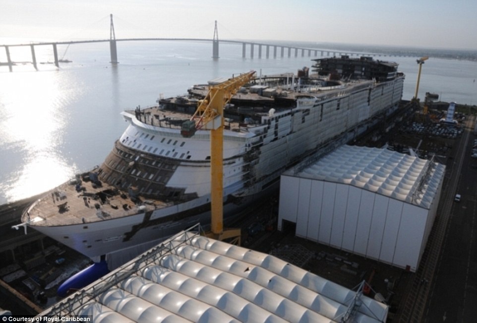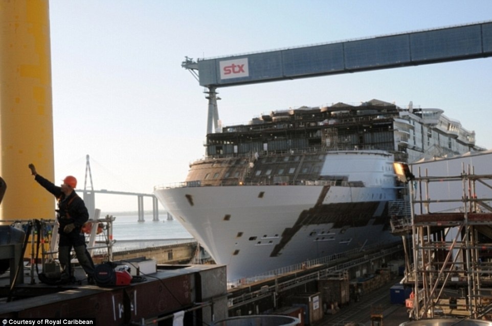Nhân viên của công ty Royal Caribbean đang hoàn thiện những khâu lắp ráp cuối cùng cho du thuyền lớn nhất thế giới trước khi nó thực hiện hành trình đầu tiên vào tháng 4/2016.