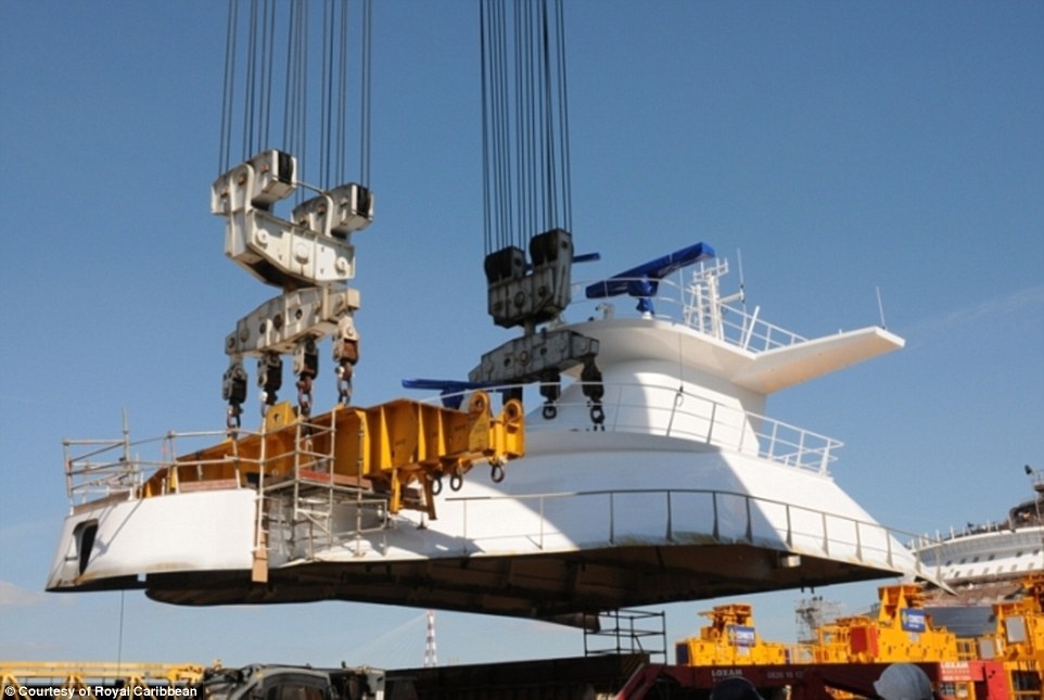 Các công nhân đang lắp khối boong cuối cùng. Ngoài 2.747 phòng ngủ và 20 khu ăn uống tự chọn, Harmony sẽ có hai bức tường leo núi, một sân trượt băng, sân bóng rổ và sân golf thu nhỏ. Ảnh: Courtesy of Royal Caribbean