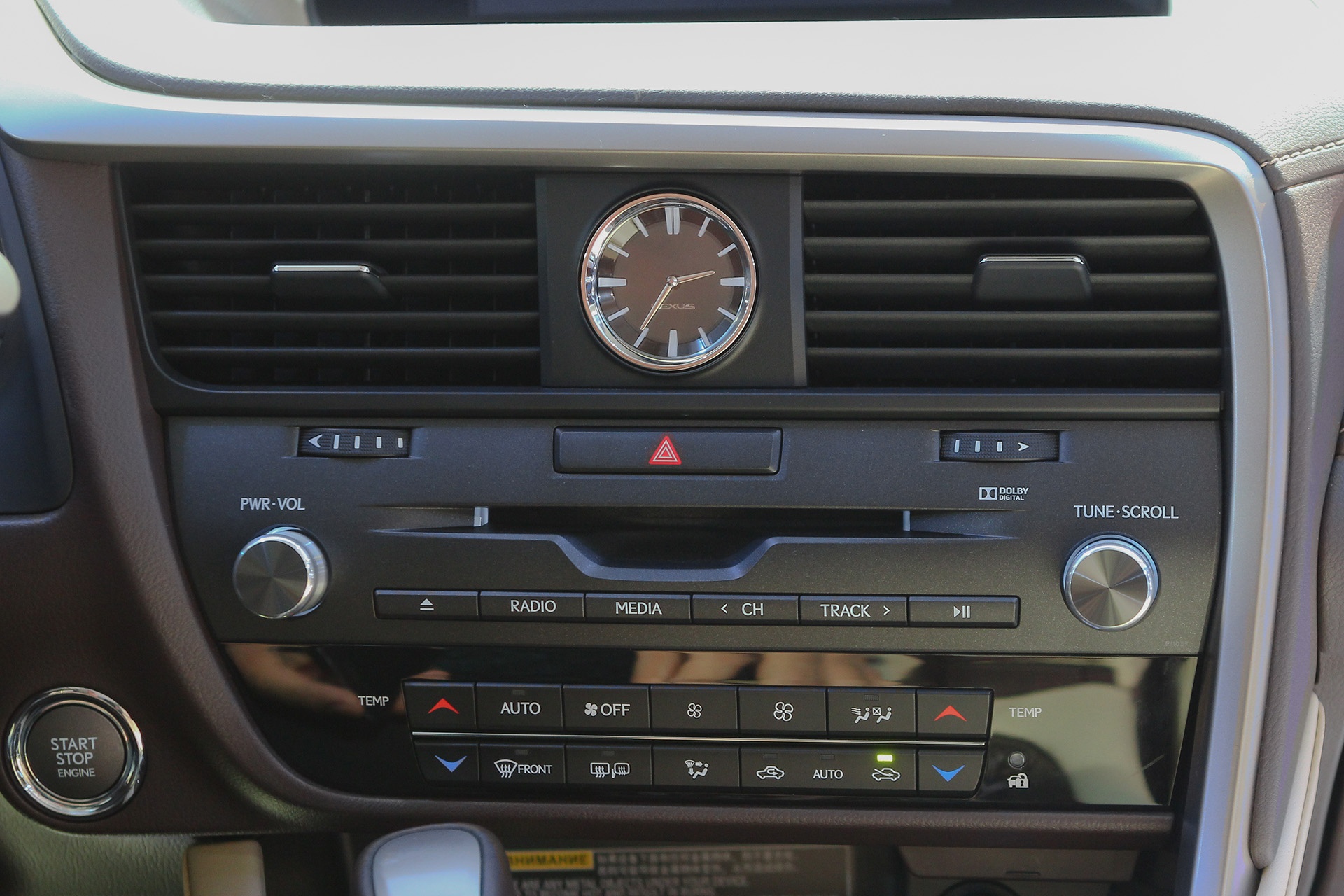 | Cụm điều khiển trung tâm của RX200t khá đơn giản, với đồng hồ analog hàng thửa đặt giữa cửa gió điều hoà. Mẫu SUV này được trang bị các kết nối Bluetooth, USB, đầu DVD với hệ thống 12 loa cao cấp Lexus Premium. Ngoài ra, Lexus còn trang bị tính năng sạc không dây cho mẫu xe này. |