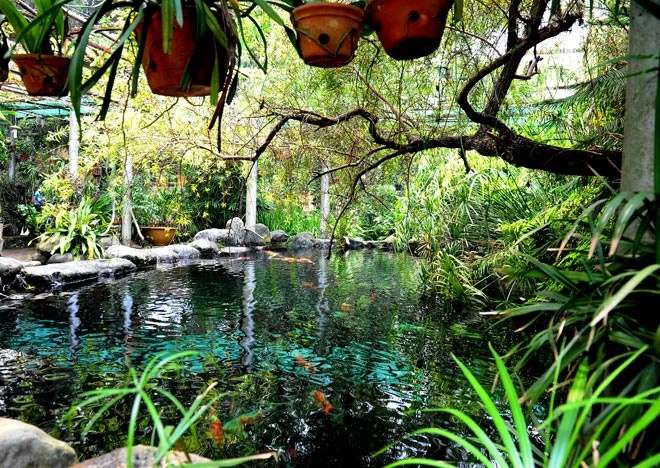 | Khu vườn rộng hàng nghìn mét vuông với nhiều cây xanh, hồ nước nhỏ. |