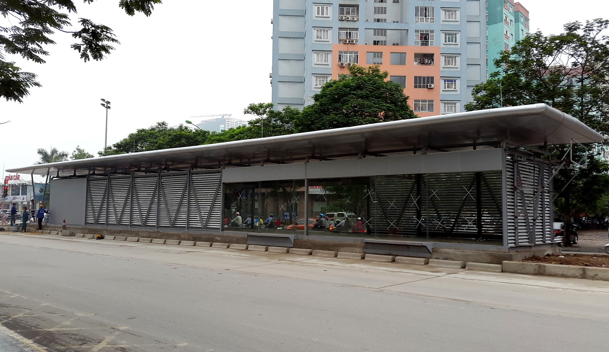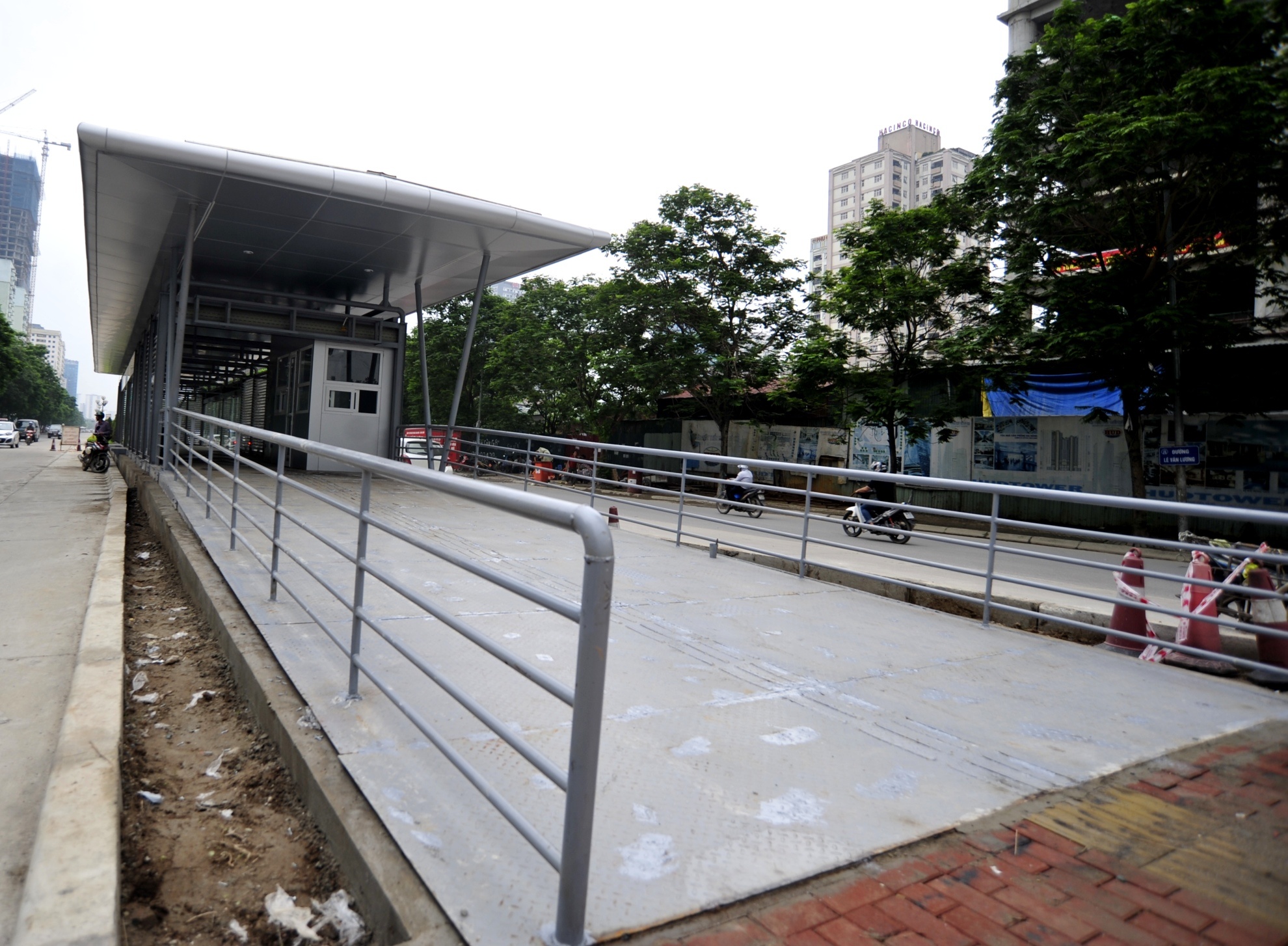 Sau gần 2 tháng thi công, nhà chờ xe buýt nhanh (Hà Nội BRT) hiện đại đầu tiên ở thủ đô gần ngã tư Lê Văn Lương - Hoàng Minh Giám sắp hoàn thành, chuẩn bị đi vào sử dụng.