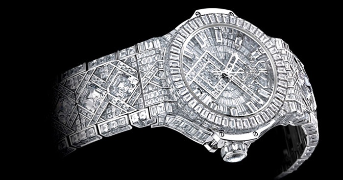 | 7. Hublot Diamond. Bạn phải bỏ đúng 5 triệu USD nếu muốn sở hữu chiếc đồng hồ đẳng cấp này. Giống như tên gọi Hublot Diamond, chiếc đồng hồ vốn được làm chủ yếu từ kim cương. Tổng cộng các thợ thủ công phải dùng đến 1200 viên kim cương, kết hợp 18 carat bạch kim để chế tác nên phụ kiện thời trang không khác gì một tác phẩm nghệ thuật lộng lẫy này. |