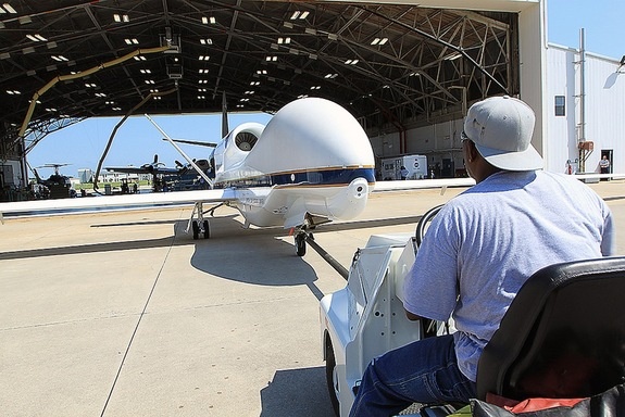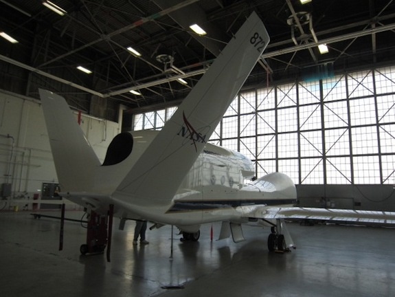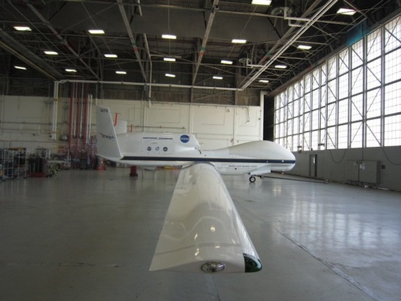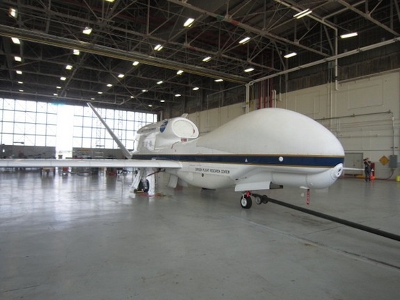 Chiếc Global Hawk của NASA được đẩy lùi vào nhà chứa. Tuy được tạm nghỉ nhưng chiếc Global Hawk luôn trong tình trạng sẵn sàng hoạt động. |