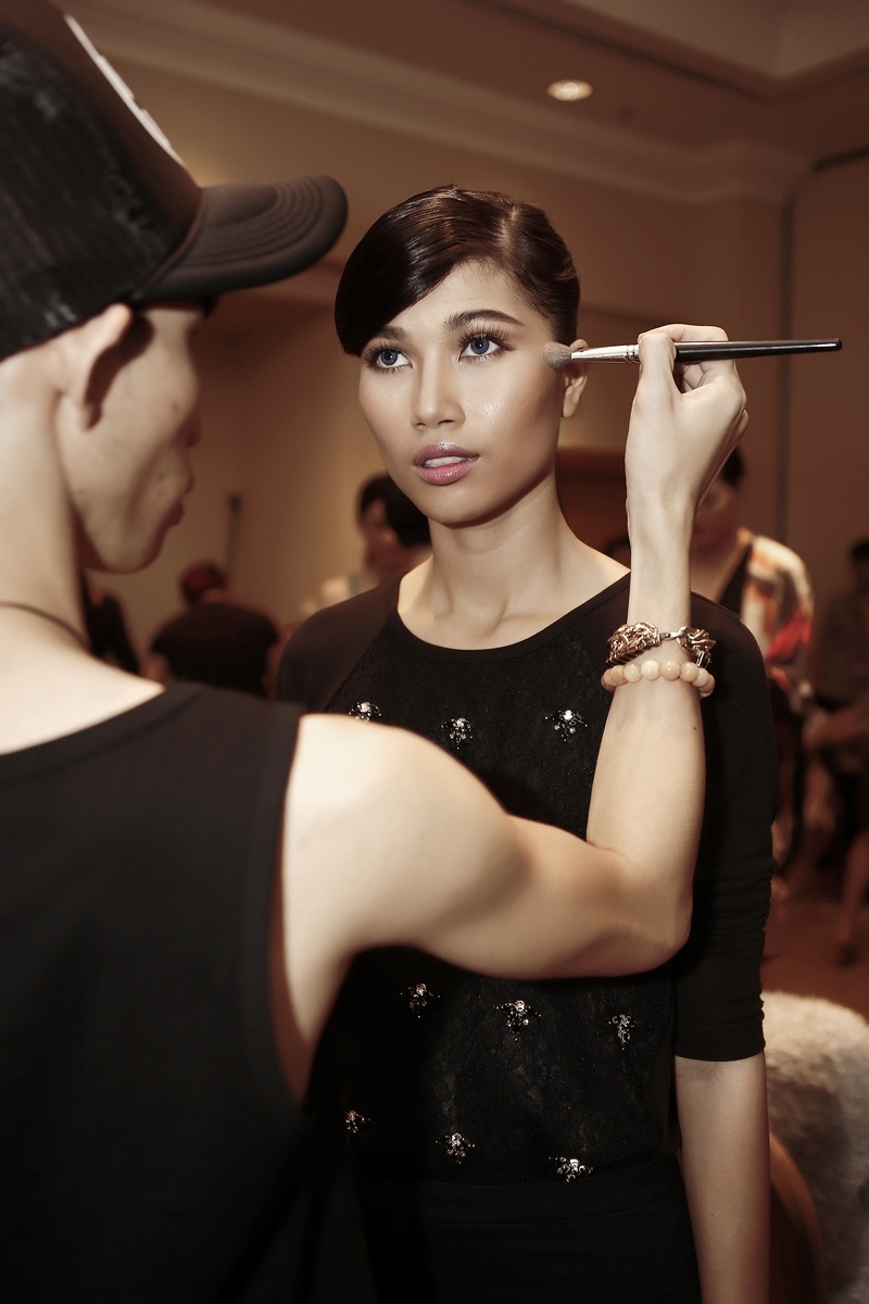 Trang Lạ được chăm chút phần trang điểm phía sau hậu trường show diễn tối qua 2/10.