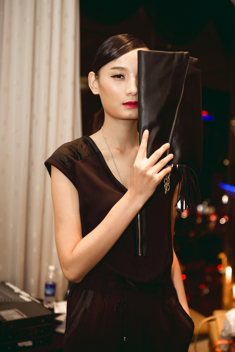 | Người mẫu Phương Nghi tinh nghịch trong lúc chờ lượt diễn của mình. |