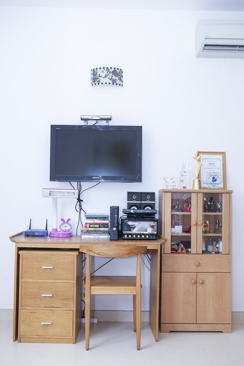 Một góc làm việc của Diệu Huyền cũng được chọn nội thất gỗ hợp tông với đồ vật trong nhà.