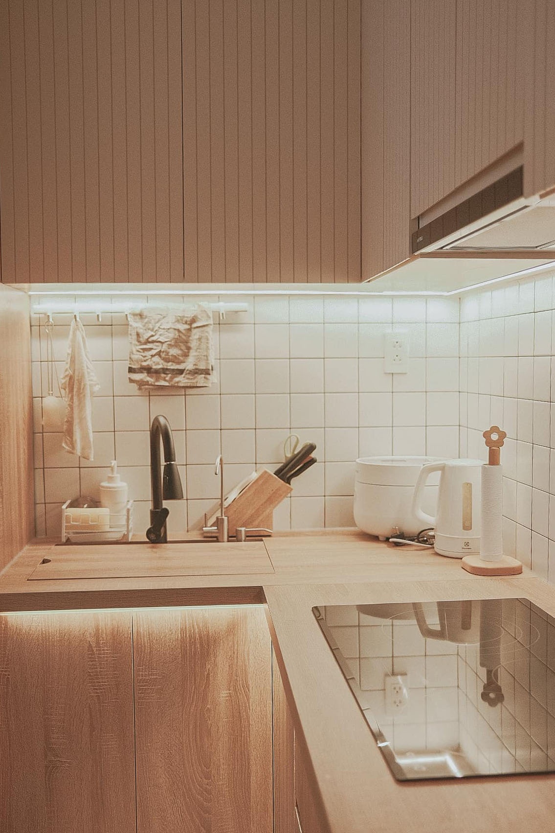 Mặt bếp nấu ăn nhỏ nên ở bồn rửa chén, tôi thiết kế thêm mặt gỗ như nắp của bồn rửa để đậy lại. Điều này giúp tôi có thêm không gian để nấu nướng.