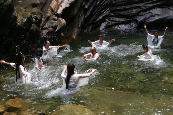 | Huỳnh Hiểu Minh và 7 nữ diễn viên xinh đẹp đã có một cảnh tắm sông hài hước trong bộ phim truyền hình Lộc đỉnh ký. |